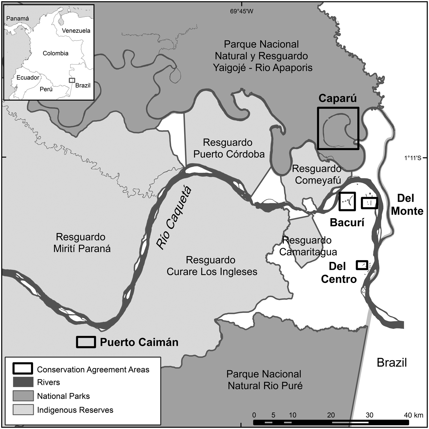 In 1998 Conservation International's Colombia programme began working in the corregimiento of La Pedrera, in the Amazonas Department bordering Brazil (Colombia is divided administratively into Departments, which comprise municipalities and corregimientos; these in turn may be divided into districts called veredas). During 2002–2004 the programme conducted a participatory environmental assessment of the Lower Caqueta river basin, with three Indigenous Reserves and two veredas. Building on previous ecological research, the assessment informed management plans for legally recognized community territories in 2005. While preparing these plans, communities identified El Francisco Creek and the lakes of Puerto Caimán, Bacurí, Del Monte and Taraira as priorities for local well-being (Fig. 1). By 2008 the management plans included resource-use rules and designated conservation areas, but the communities lacked the means to carry out management activities. Outsiders continued to fish pirarucú Arapaima gigas and silver arowana Osteoglossum bicirrhosum within the conservation areas, using destructive methods and harvesting fish below the legal minimum catch-size; local fishers, seeing the rules violated with impunity, followed suit.