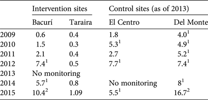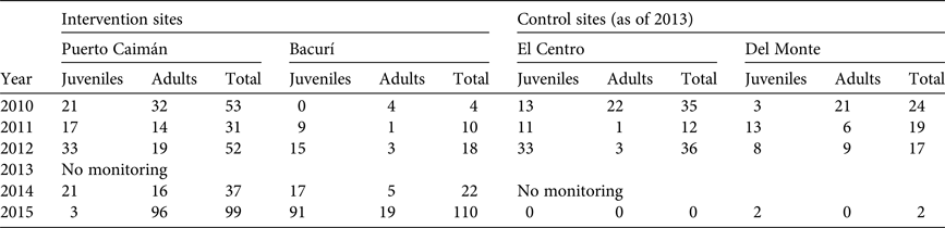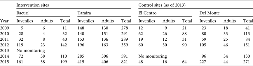 The National University of Colombia, through its Amazonian Research Institute, and Conservation International developed the initial ecological monitoring protocol, informed by community knowledge of the ecosystems. The biodiversity baseline was established in 2008, focusing on the lakes and excluding El Francisco Creek, as there is no robust monitoring framework for measuring pirarucú or arowana in rivers. Annual third-party monitoring was then conducted by the University of Antioquia, focused on the lakes of Puerto Caimán (Curare–Los Ingleses), Bacurí (Madroño) and Taraira (Yaigojé–Apaporis). In 2013, river levels were unusually high; continuous connectivity between rivers and lakes precludes reliable counts, so monitoring was foregone at all sites that year. In 2015 the monitoring effort also examined Del Monte and El Centro lakes (Villa Marcela), not covered by agreements, for comparison with lakes covered by the project. (Although the Villa Marcela agreement was terminated in 2013, the community consented to monitoring in Del Monte in 2014, and both Del Monte and El Centro in 2015.) Since 2013 Del Monte and El Centro lakes have served as control sites, as per impact evaluation practice (Ferraro & Hanauer, Reference Ferraro and Hanauer2014). Ideally project monitoring would have incorporated control sites from the outset, and strictly speaking the way the two non-project lakes came to be included does not conform to best practice for randomized controls (Ferraro & Pattanayak, Reference Ferraro and Pattanayak2006). However, the impracticality of ideal monitoring and evaluation scenarios is well known (Baylis et al., Reference Baylis, Honey-Rosés, Börner, Corbera, Ezzine-de-Blas and Ferraro2016). Given the realities of implementing conservation in practice, treating Del Monte and El Centro as comparison sites in a natural quasi-experiment illustrates a practical approach that permits inferences regarding project impacts.