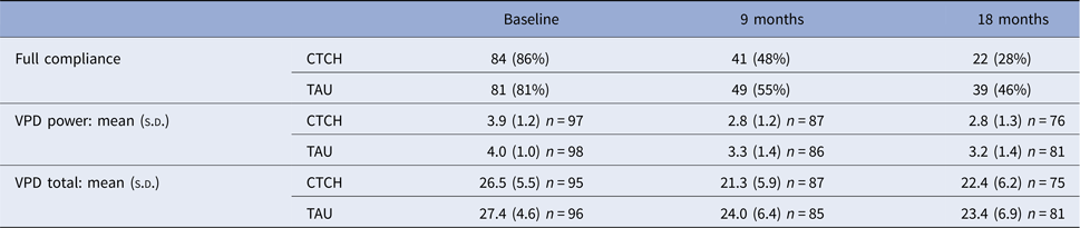 The evaluation of the primary outcome was through an intention-to-treat (ITT) analysis using a logistic regression, allowing for centre membership and severity of command hallucinations at baseline. This is detailed in our primary publication (1) but in summary, 197 participants (see Table 1) were randomly assigned (98 to CTCH + TAU and 99 to TAU), representing 81.4% of eligible individuals. At 18 months, 46% of the TAU participants fully complied compared to 28% of those receiving CTCH + TAU (odds ratio = 0.45, 95% CI 0.23–0.88, p = 0.021). A summary of outcome and mediator measures over time by randomisation group is shown in Table 2. The estimate of the treatment effect common to both follow-up points was an odds ratio of 0.57 (95% CI 0.33–0.98, p = 0.042); that for 18-month compliance was an odds ratio of 0·45, 95% CI 0.23–0.88, p = 0·021. The total estimated treatment effect for VPD-total common to both time points was −1.819 (95% CI −3.457 to −0.181, p = 0.03). For the VPD-power differential item, the estimated treatment effect for both time-points was –0.52 (–0.849 to –0.185, p = 0.002).