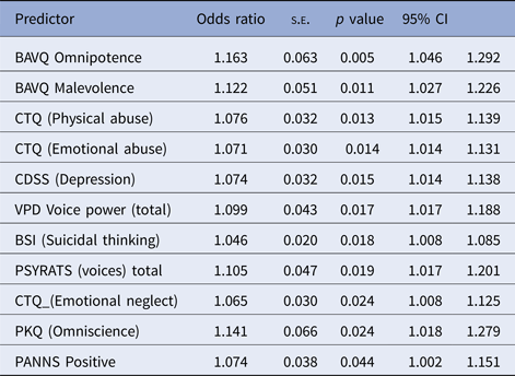 In our main results paper (Birchwood et al. Reference Birchwood, Michail, Meaden, Tarrier, Lewis and Wykes2014) we highlighted two outstanding questions from our protocol (Birchwood et al. Reference Birchwood, Peters, Tarrier, Dunn, Lewis and Wykes2011), of theoretical and clinical importance. First, what are the key baseline predictors of outcome at 18 months? Here we are interested in whether it is voice beliefs, psychosis severity, demographic and historical factors, treatment allocation, or a combination of these, which predict further acts of harmful compliance; our preliminary study found voice power to be the best individual predictor (Bucci et al. Reference Bucci, Birchwood, Twist, Tarrier, Emsley and Haddock2013). Second, while these results were in line with predictions (changes in power and in compliance) we did not establish voice power as the mediator of change, as predicted by our model. This paper addresses each of these questions.