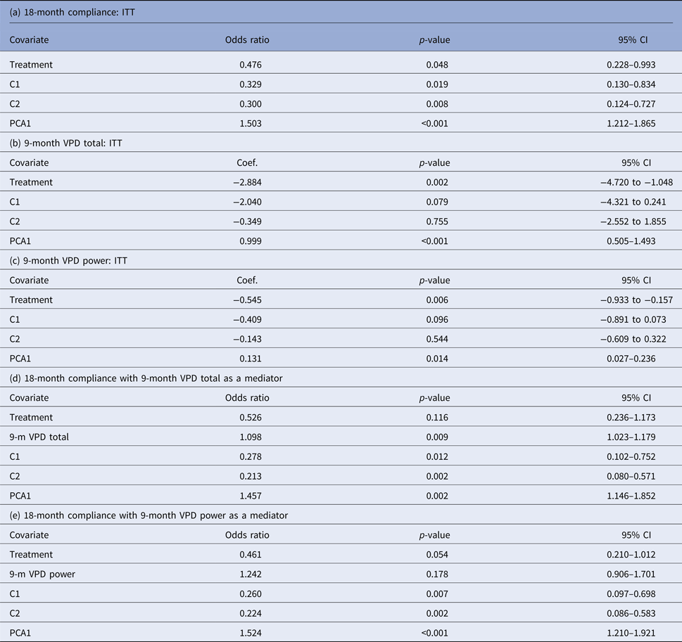Here, again, all initial statistical analyses were carried out using Stata version 13 (StataCorp, 2013). The analyses are aimed at evaluating the potential mediating role of voice power (VPD) (either the total score or the power differential item) in the treatment effect on compliance at 18 months. The main potential threat to the validity of the findings is confounding of the effect of the mediator (VPD) on outcome (Compliance), even though the treatment itself has been randomised. Another threat (or source of bias) is measurement error in the putative mediator. First, we concentrated on adjustment for confounding. The logistic regression model for the outcome (18-month compliance) initially included the effects of treatment and the following covariates: centre membership (two binary dummy variables, C1 and C2) the first principal component score (PCA1) obtained from the above analysis of potential predictors (defined in the ’Results’ section). This produced a revised intention-to-treat effect. PCA1 was included because it is likely to be an important confounder of the effect of the putative mediator on the clinical outcome – being a powerful predictor of both the VPD scores and 18-month compliance. Linear regression models for the putative mediator (VPD-total score at 9 months or the VPD-power item) included the effects of treatment and the same set of covariates. Finally, the second pair of logistic regression models for 18-month compliance was fitted, containing the same variables as the first ones above but, with the addition of the putative mediators: the 9-month values for either the VPD total score or the VPD power item. The latter models were also fitted using Stata's paramed command (Emsley et al. Reference Emsley, Li, Dunn, Valer and VanderWeel2014; Dunn et al. Reference Dunn, Emsley, Liu, Landau, Green and White2015): in order to obtain estimates of the direct, indirect and total effects of treatment. Standard errors and 95% CI were used via the use of bias-corrected bootstrap methods (each based on 1000 bootstrapped samples) – see (Efron and Tibshirani, Reference Efron and Tibshirani1993). Readers should be aware that the total effects of treatment will not correspond exactly to the estimate reported in the original trial report (Birchwood et al. Reference Birchwood, Michail, Meaden, Tarrier, Lewis and Wykes2014). Hence, the phrase ‘revised intention-to-treat effect’ as used above. This is not a sign of disagreement but follows from the fact that treatment effects are being estimated using odds ratios, conditional on the other covariates in the model. As the additional covariates change so does the definition of the treatment effect (unlike the case when using linear regression/ANCOVA models for quantitative outcomes).