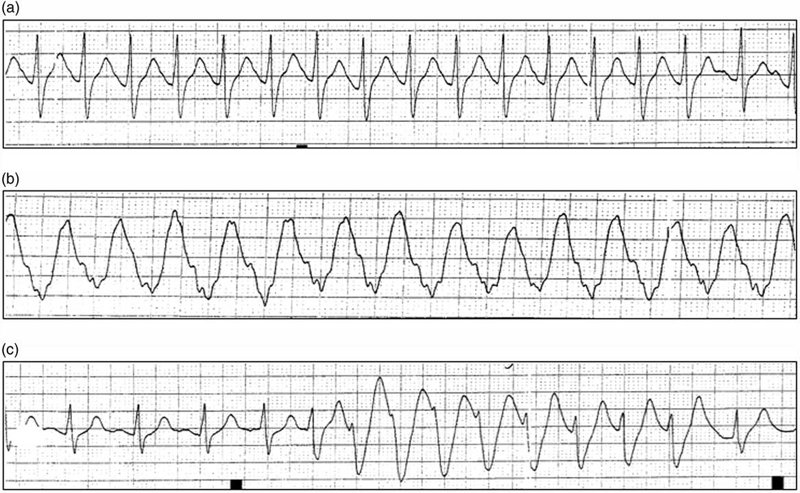 Figure 1 (a) Rhythm strips obtained following the initial presentation and resuscitation. Rhythm strip demonstrating narrow complex tachycardia (three to five hours post-ingestion). (b) Post–cardiac arrest rhythm strip demonstrating wide complex tachycardia (four to seven hours post-ingestion). (c) Example of recurrent, self-limited ventricular tachycardia (six to eight hours post-ingestion).