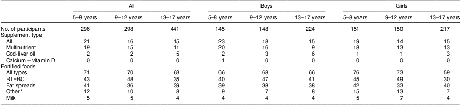A total of fifty-two vitamin D-fortified foods were recorded during the Children's Survey (3 % of all foods, excluding supplements), of which 37 % were RTEBC, 33 % were fat spreads and 4 % were milks. During the Teens’ Survey, forty-one vitamin D-fortified foods were recorded (2 % of all foods, excluding supplements), of which 44 % were RTEBC, 37 % were fat spreads and 2 % were milks. A total of 71 % of 5–8-year-olds, 70 % of 9–12-year-olds and 63 % of 13–17-year-olds consumed a vitamin D-fortified food at least once during the recording days, mainly RTEBC and fat spreads (Table 2). Vitamin D-fortified milk was consumed by <5 % of participants. There was no significant difference in the prevalence of total vitamin D-fortified food consumption between boys and girls.