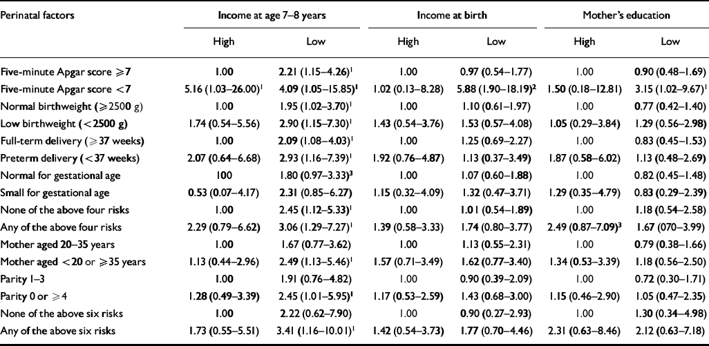 | Perinatal factors | Income at age 7-8 years | Income at birth | Mother's education | |||