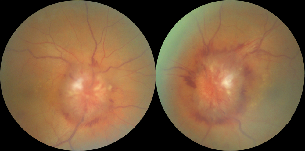 Figure 1: Fundus photographs demonstrating severe bilateral optic nerve head swelling.