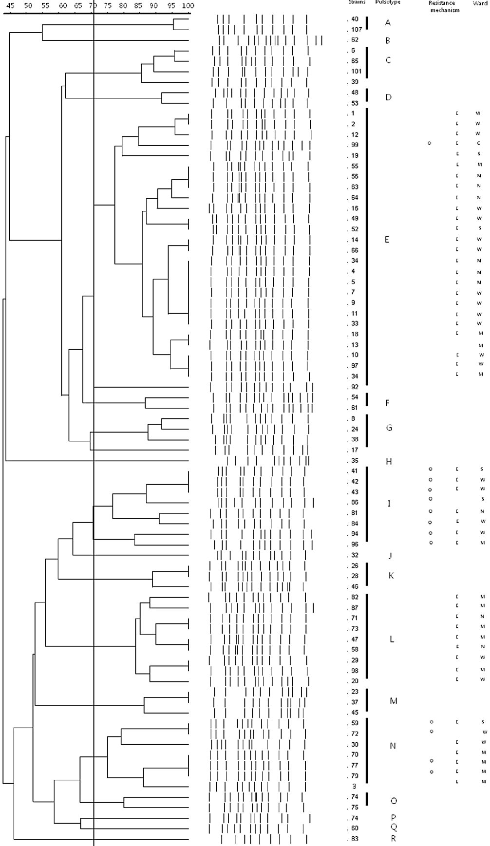 Fig. 1. Dendrogram of PFGE types of carbapenem-resistant A. baumannii strains. Strains producing ISAba1-enhanced bla OXA-23-like (O); efflux pump overexpression (E); surgical intensive-care unit (ICU) (S); medical ICU (M); neurosurgery ICU (N); coronary care unit (C); general wards (W).