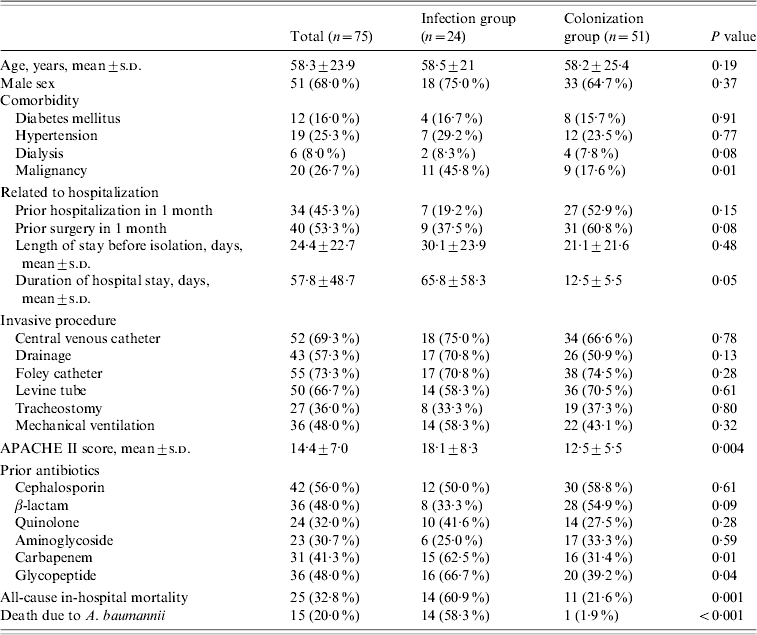 A comparison of the clinical characteristics and outcomes of the 75 patients colonized or infected with CRAB is shown in Table 1. The mean age was 58·3±23·9 years and 68% were male. Twenty-four patients were defined as infected and 51 patients as colonized. More patients with infection had malignancies and longer duration of hospital stays as well as higher APACHE II scores. The use of carbapenems and glycopeptides prior to A. baumannii isolation was more frequent in the infected group and both the all-cause in-hospital mortality and the A. baumannii-attributable mortality were higher in this group. The presence of invasive devices such as central venous catheter, urinary catheter, or surgical drainage was not a significant risk factor for A. baumannii infection. Univariate analysis showed that the risk factors associated with infection were malignant disease, duration of hospital stay, APACHE II score, and prior use of carbapenems and glycopeptides. Of these, malignancy as underlying disease and high APACHE II score (>15) were significantly associated with A. baumannii infection on multivariate analysis (P< 0·05).