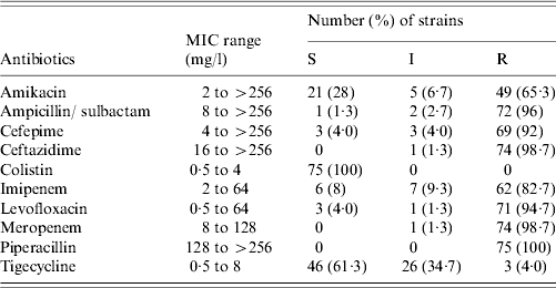The susceptibility patterns of the 75 A. baumannii strains are shown in Table 2. Most exhibited resistance (>95%) across different classes of agents notably ampicillin/sulbactam, ceftazidime, levofloxacin and piperacillin. Six isolates showed carbapenem discordant susceptibility (intermediate or resistant to meropenem, but susceptible to imipenem). All strains were susceptible to colistin but 38·7% were intermediate or fully resistant to tigecycline.