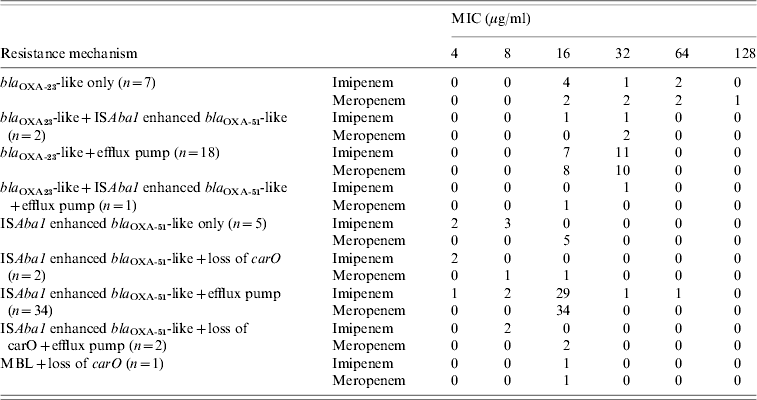 Table 3. Effect on carbapenem minimum inhibitory concentrations (MICs) of resistance mechanism in A. baumannii
