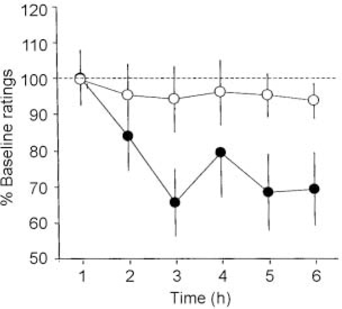 Fig 3 Clinical ratings of manic symptoms using the Beigel Manic State Rating Scale. Filled circles represent the scores of patients receiving the TYR-free drink; open circles represent the scores of patients receiving the BAL amino acid drink. Data are presented as the mean of percentage baseline ratings ± 1 s.e. Administration of the TYR-free drink reduced clinical ratings of mania significantly relative to the BAL drink (main effect of treatment: F=4.5, P<0.05).