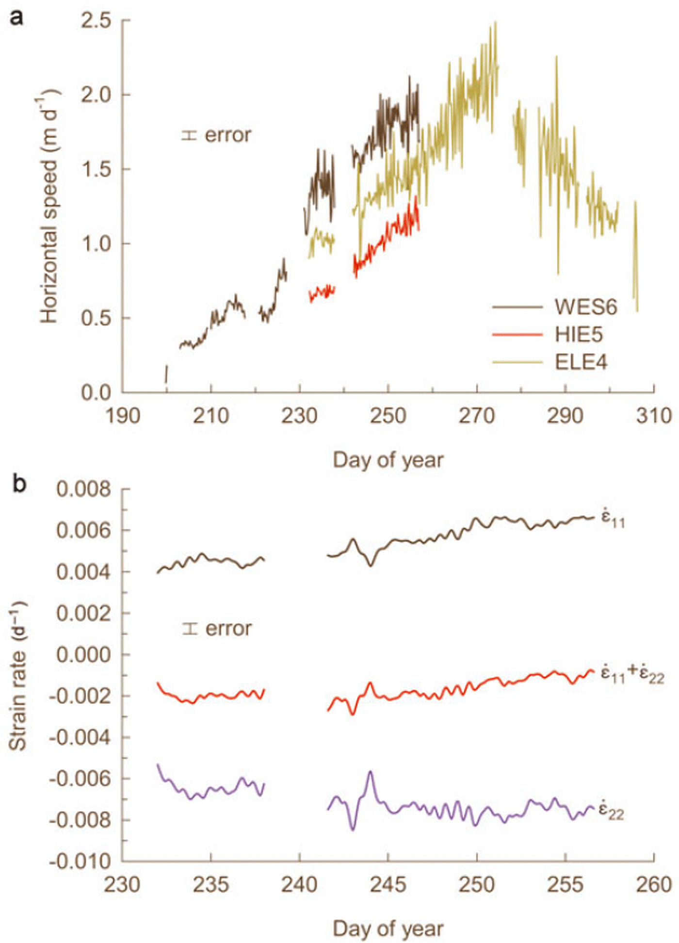The strain rate associated with glacier thickening for the period 3 January to 19 April 2005 can be roughly estimated (Fig. 6) at about (0.6md–1) / 100m ≈ 0.006 d–1 near the ECG ‘centerline’. There were never two GPS units simultaneously on the reach being squeezed, so we cannot estimate the longitudinal strain rate within that domain. The longitudinal strain rate in the domain bounded by ICY5 and ICY4 can be estimated as the difference in flow speed divided by separation, or (–0.9md–1) / 350m ≈ –0.0026 d–1; a value otherwise known only from surge fronts (Reference KambKamb and others, 1985).