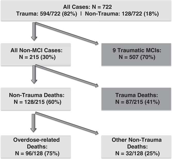 Attributed causes initially were divided into trauma- (594/722; 82%) and non-trauma-related (128/722; 18%) categories. Trauma-related deaths included nine MCIs (ie, 10 or more fatalities; n=507). The majority of MCI deaths were the result of stampedes/trampling (eg, Emeneya Music Festival in 2014, Democratic Republic of Congo [n=21]; Love Parade in 2010, Germany [n=21]; Mawaxine Festival in 2009, Morocco [n=11]; Cambodian Music Festival in 2008 [n=347]; South Korea in 2005 [n=11]; and Sports Palace Festival in 1999, Belarus [n=54]). One structural failure resulted in 16 fatalities (K-Pop Festival in South Korea, 2014). Two music festivals were the targets of acts of terror, including two bombings causing trauma-related deaths (Wings Festival in 2003, Moscow [n=16]; and Bangladesh New Year’s Festival in 2001 [n=10]). Removing all nine MCIs from the analysis reduced the total number of all-cause fatalities substantially (n=215).