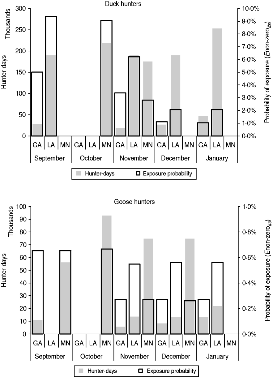 This study quantitatively estimated the risk of human exposure to avian influenza viruses associated with waterfowl hunting activities, particularly hunting of ducks and geese. The effects of temporal and spatial variation were taken into account by modelling the exposure risk associated with hunting activities from September to January (based on the dates for the hunting season of 2010–2011) in three different states: Georgia (GA), Louisiana (LA) and Minnesota (MN). Differences in hunting practices and intensity among these states, as well as the difference in avian influenza virus (AIV) prevalence between juvenile and adult birds were accounted for. Exposure risk (per hunter-day) is compared among states to evaluate the potential for regional variation, which has great application to risk management. Finally, the monthly variation in exposure risk is compared to the seasonal incidence of human influenza A viruses in order to discuss the potential for co-infection.