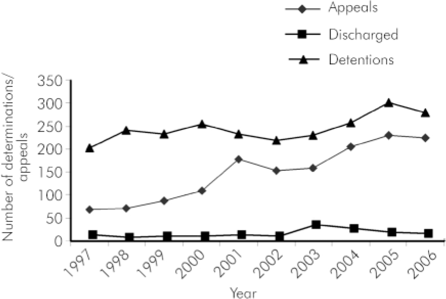 Data were collected from the local Mental Health Act office for the period 1996-2007 to study the trends in number of detentions under the Act, number of appeals, percentage of detentions going to appeal, the result of the appeals and the proportion of appeals that resulted in discharge from the restrictions of the Mental Health Act. Data were restricted to people detained under Sections 2, 3 or 37/41 of the Act, since it is only these sections for which there are rights of appeal. Results of appeals were recorded as ‘compulsory detention upheld’, ‘patient discharged’, ‘no decision, further hearing requested’ and ‘hearing cancelled or adjourned’. The last category was excluded from the analysis, since we wanted to study the pattern of hearings that actually occurred.
