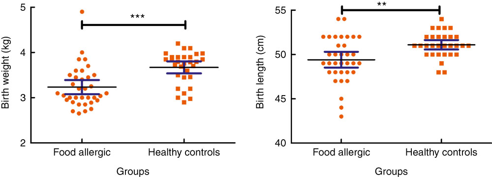 Fig. 1 Comparison of birth weight and birth length between groups. Values are means and 95% confidence intervals. **P<0·01, ***P<0·001.