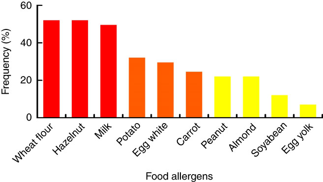The results of our previous study on non-fatal anaphylactic attacks among sixty-three Iranian children revealed that the most common causes of anaphylactic reactions were milk and wheat( Reference Barzegar, Rosita and Pourpak 19 ). In another study, milk, egg and wheat were determined to be the most common food allergens among 313 Iranian allergic children( Reference Hosseini, Shoormasti and Akramian 20 ). The results of current study were compatible with our previous findings in terms of common food allergens among atopic children. Accordingly, wheat, hazelnut, cow’s milk and egg white were found to be the most common food allergens.