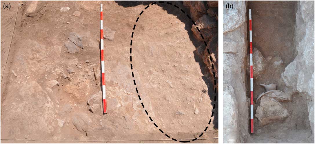 Figure 7 (a) The section in the courtyard, looking east. Note the chalk tablets (mainly in the left) and the hard, compact earth (to the right), which was subsequently excavated and in which the foundation deposit (Figure 7b) was unearthed (approximate area is marked); (b) the foundation deposit below the floor of space 101A3 in the course of the excavations (looking east).