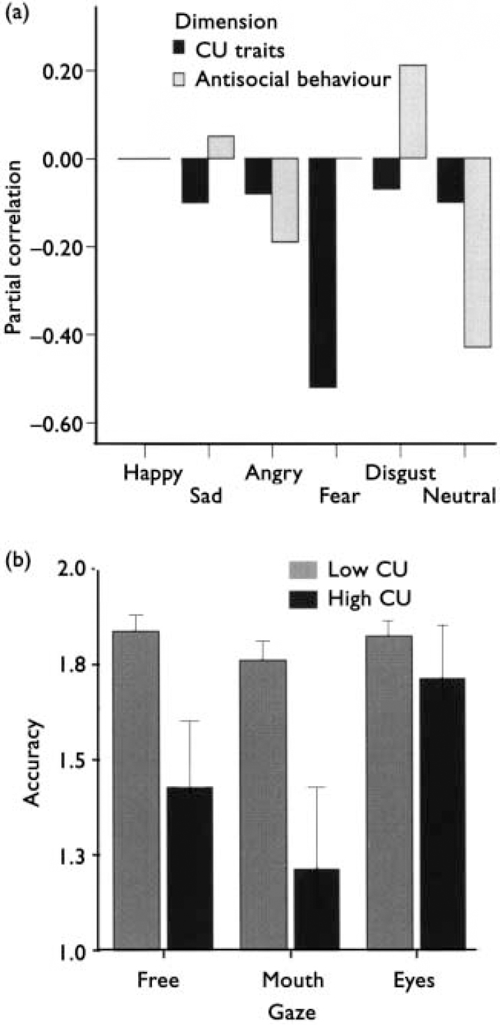Fig. 1. (a) Partial correlations of antisocial (controlling for callous-unemotional (CU) traits) and CU traits (controlling for antisocial) with accuracy of recognition of the six emotions for boys in study 1. (b) Mean accuracy for facial fear recognition for boys high and low on CU traits under three gaze conditions: no instruction, instruction to focus on eyes, instruction to focus on mouth. Significant interaction between gaze and CU category, F (2,55)=5.149, P=0.009. Error bars represent standard errors of the means.