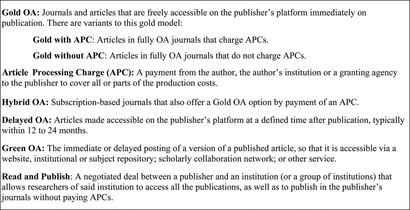 Open Access is a growing phenomenon that requires context. A 2017 report of the Universities UK Open Access Coordination Group using the Scopus database suggests the growth in the number of OA publications has stalled somewhat in recent years. In 2016, 38 per cent of academic journals indexed in Scopus were still under a classic subscription model. Another 45 per cent were under a hybrid model combining subscriptions and OA with APCs, while 15 per cent were entirely Gold OA (the majority of which charged APCs). These trends are confirmed by several studies on OA using different methodologies (Piwowar et al., Reference Piwowar, Priem, Larivière, Alperin, Matthias, Norlander, Farley, West and Haustein2018).