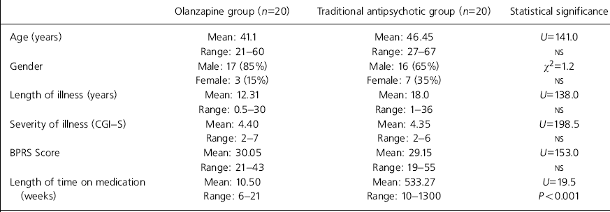 As can be seen in Table 1, the two groups were well matched for age, gender, length of illness, severity of illness and psychopathology (using the BPRS). Accurate data on length of treatment were available for all patients in the olanzapine group and for 11 in the traditional antipsychotic group; this was significantly longer in the latter group.