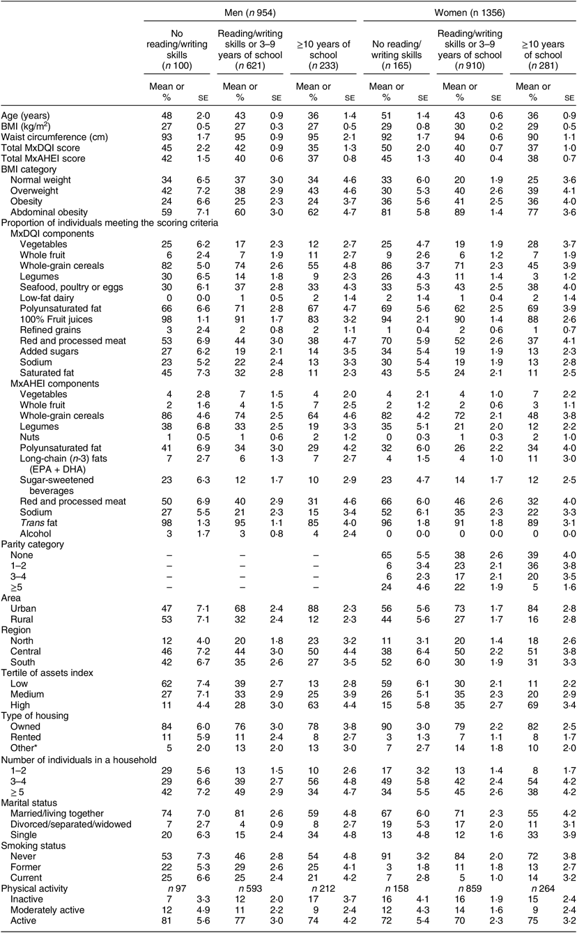 ENSANUT, National Health and Nutrition Survey, MxDQI, Mexican Diet Quality Index, MxAHEI, Mexican Alternate Healthy Eating Index. Data for age, BMI, waist circumference, total MxDQI score and total MxAHEI score are presented as mean and se; all other data are presented as % and se.