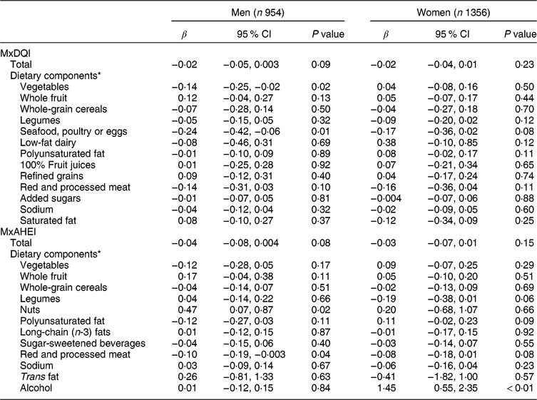 Among men, a one-unit increase in total MxDQI and total MxAHEI scores was associated with a reduction in WC of 0·10 (95 % CI 0·004, 0·20) cm and 0·15 (95 % CI 0·01, 0·28) cm, respectively. With regard to specific components, we observed that seafood, poultry or eggs as well as red and processed meat components were inversely associated with WC. In women, dietary scores were not associated with WC (Table 4).