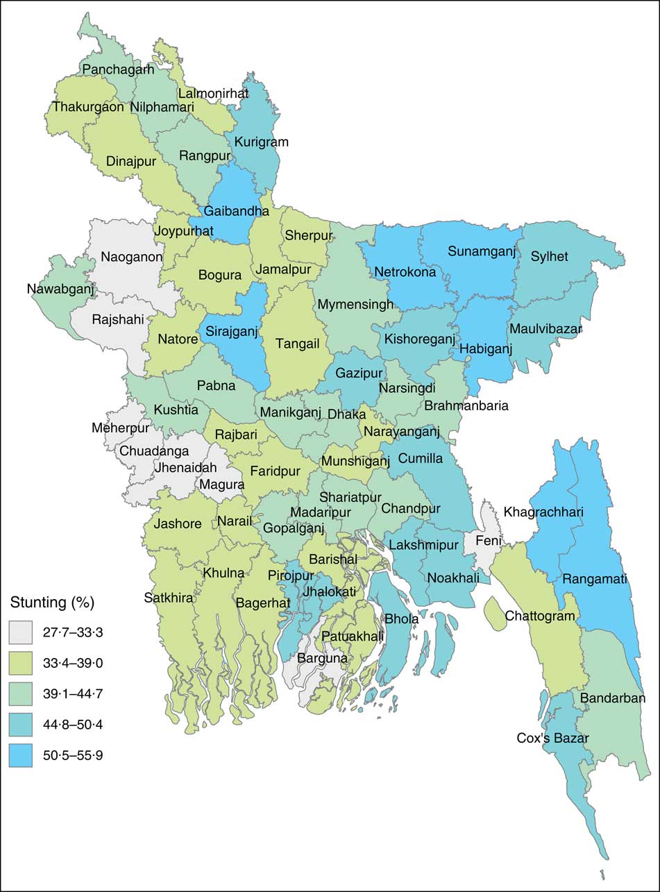 Fig. 1 (colour online) Prevalence of stunting among children <5 years of age in different districts in Bangladesh, 2012–2013