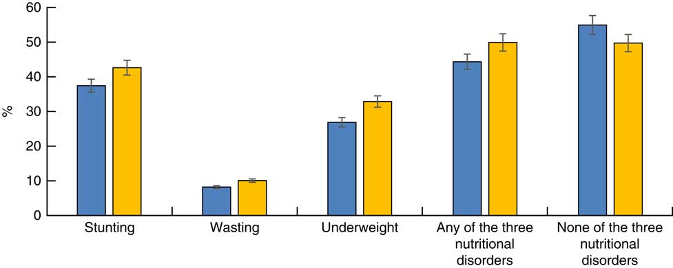 Fig. 2 (colour online) Estimates of child nutritional disorders (vertical bars represent percentages and error bars represent 5% errors in both directions) by parent’s migration status (