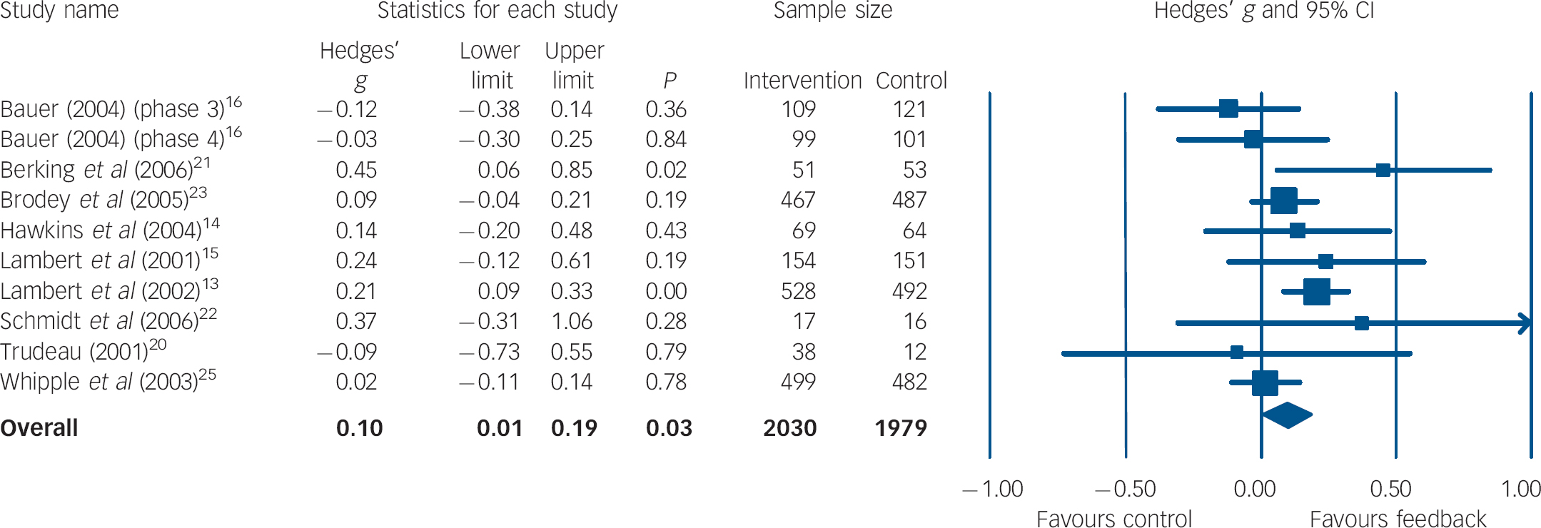 Even though the aggregated sample size of included studies would appear sufficient, the number of studies these data were drawn from was small and not particularly representative. Additionally, the number of researchers conducting this research is very small, and could introduce bias through a number of avenues. This meta-analysis has a number of further drawbacks. First, assessed studies varied considerably with regard to certain patient characteristics, most notably illness severity and comorbid disorders. The majority of trials relied on data from people with rather mild mental illness treated with out-patient psychotherapy. Second, the number of studies decreased rapidly when we tried to answer more specific questions (e.g. long-term effects, moderators). As a result of variations in study designs, measurement points had to be pooled in order to be able to examine persistence of effect. Third, except in one study, feedback was based on patient-reported outcomes whereas it might be worthwhile to also have data obtained from independent raters. Fourth, in the vast majority of the trials, the unit of randomisation was the patient, which might entail cross-contamination, Reference Gilbody, House and Sheldon8 i.e. ‘real’ effects of the intervention are watered down because of a general sensitisation since one clinician receives feedback for some patients but not for others.
