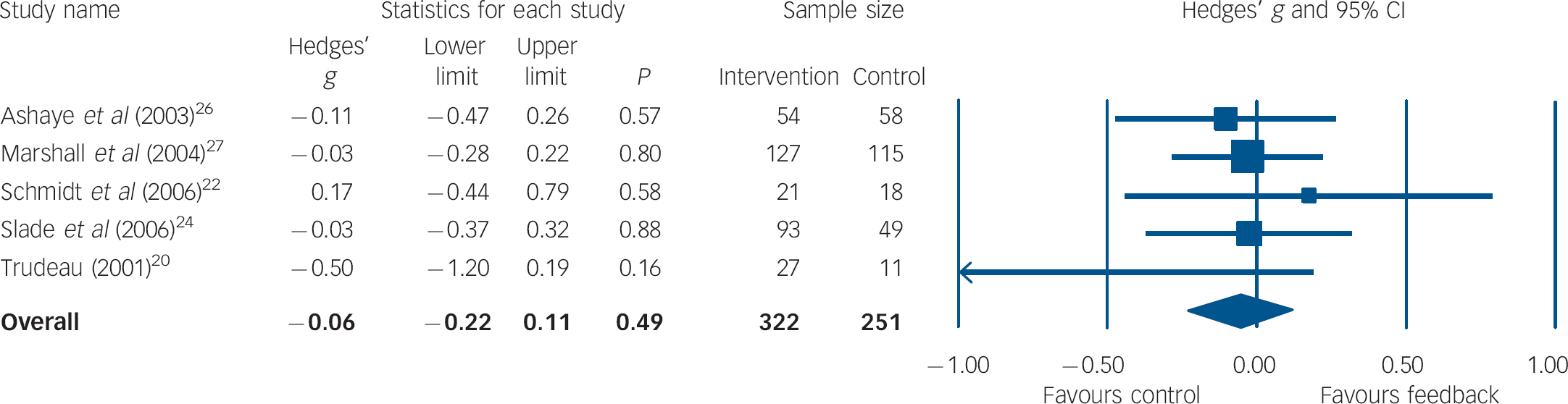Most of the studies included measured the impact of feedback on individuals' mental health status at the end of treatment or within 9 weeks after intake. Two of these nine trials also evaluated long-term effects. Reference Trudeau20,Reference Schmidt, Landau, Pombo-Carril, Bara-Carril, Reid and Murray22 The remaining three studies Reference Slade, McCrone, Kuipers, Leese, Cahill and Parabiaghi24,Reference Ashaye, Livingston and Orrell26,Reference Marshall, Lockwood, Green, Zajac-Roles, Roberts and Harrison27 reported follow-up measurements only (Table 2).