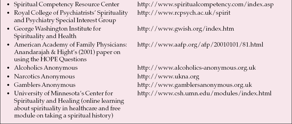 | • Royal College of Psychiatrists’ Spirituality and Psychiatry Special Interest Group | http://www.rcpsych.ac.uk/spirit |