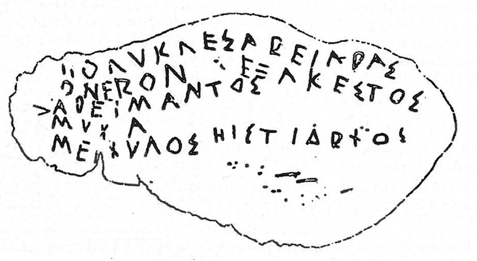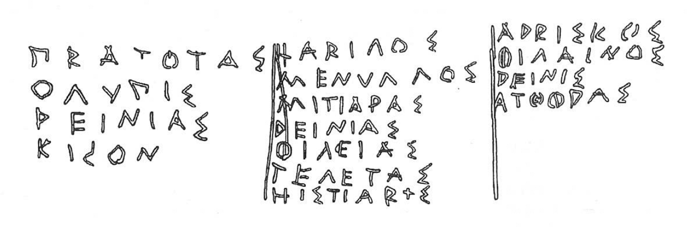 Let there be utter destruction both of these men and of their kin! Nikullos the son of Kaposos, Dendilos the son of M <n>amon (?), Ainon the son of Blepon, Xenios the son of Apontis of the Herakleidai, Sauris, Athanis the son of Tammaros of the Herakleidai, Ras Pharmaua (?), Dion, Piakis, Pithias, Xaion, Mammaron(?), Zoita (?), Agathyllos the son of Xenios of the Herakleidai, Sunetos the son of Xenon.