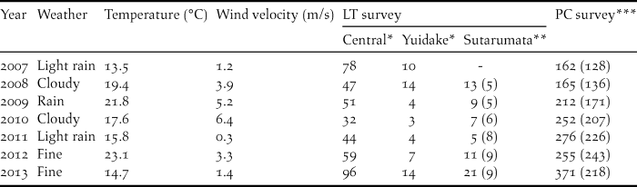 Table 1. The number of singing Amami Thrushes recorded in two types of song-count surveys during each research year. Weather, temperature and wind velocity were recorded on the day of the LT survey each year.