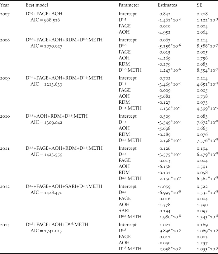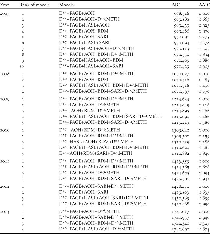 n:METH). Higher-ranked models (with the value of ∆AIC being less than 2) were listed to examine the factors important for improved prediction of thrush abundance in each research year.
