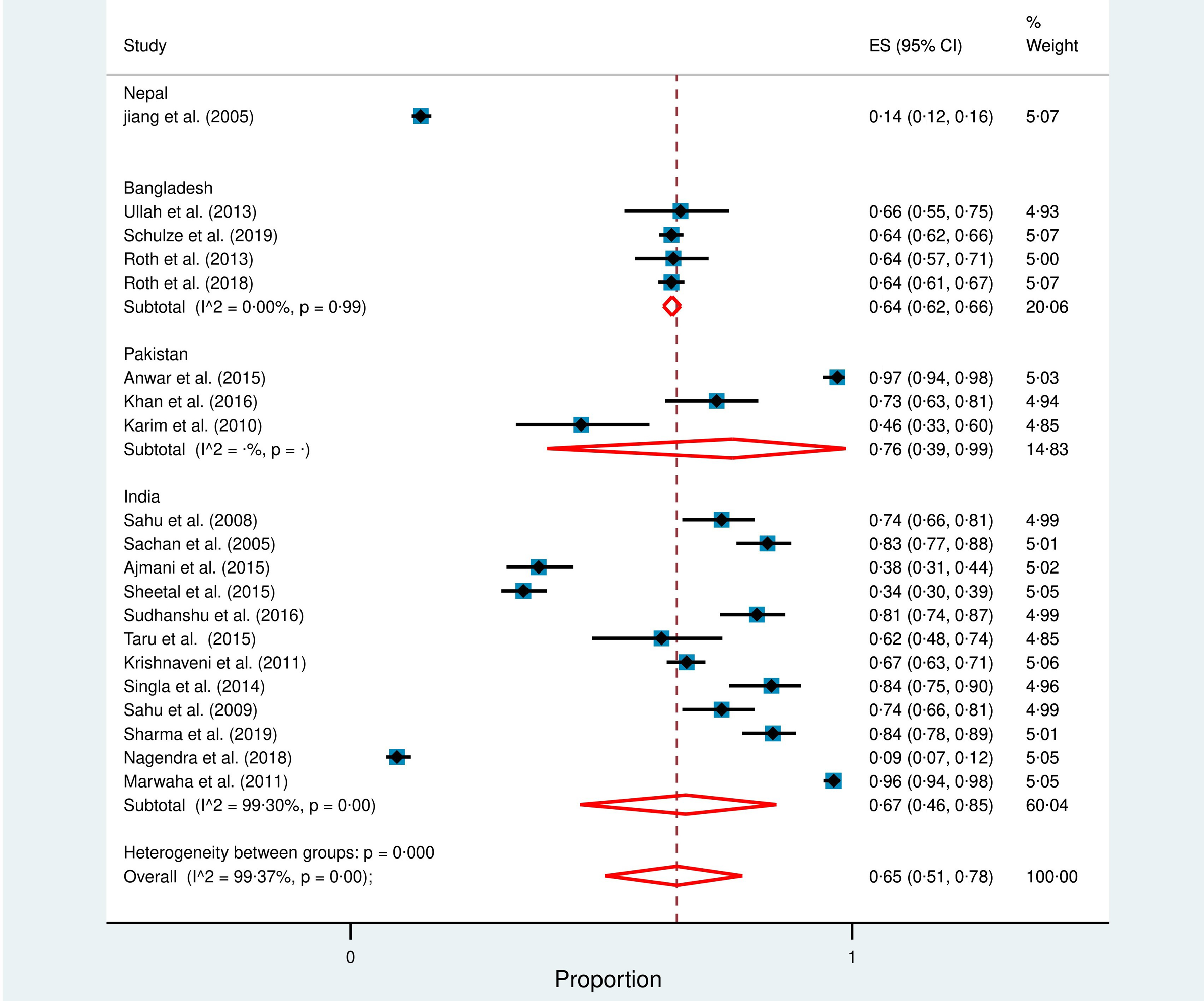 While all of the hypotheses proposed above could be contributing to the observed heterogeneity, slightly different cut-off values (other than < 20 ng/ml) used by some of studies that were included in this systematic review(Reference Sachan, Gupta and Das36,Reference Sharma, Kumar and Prasad38,Reference Gupta, Wahi and Gupta40,Reference Ullah, Koch and Tamanna47,Reference Roth, Al Mahmud and Raqib49,Reference Roth, Morris and Zlotkin50,Reference Jiang, Christian and Khatry54) might have influenced the degree of heterogeneity in our analysis. However, such heterogeneity may not be uncommon as we have demonstrated in one of the similar studies on SA adult population(Reference Siddiqee, Bhattacharjee and Siddiqi72). However, it is clear that further study is required to reveal the true source and extent of heterogeneity.