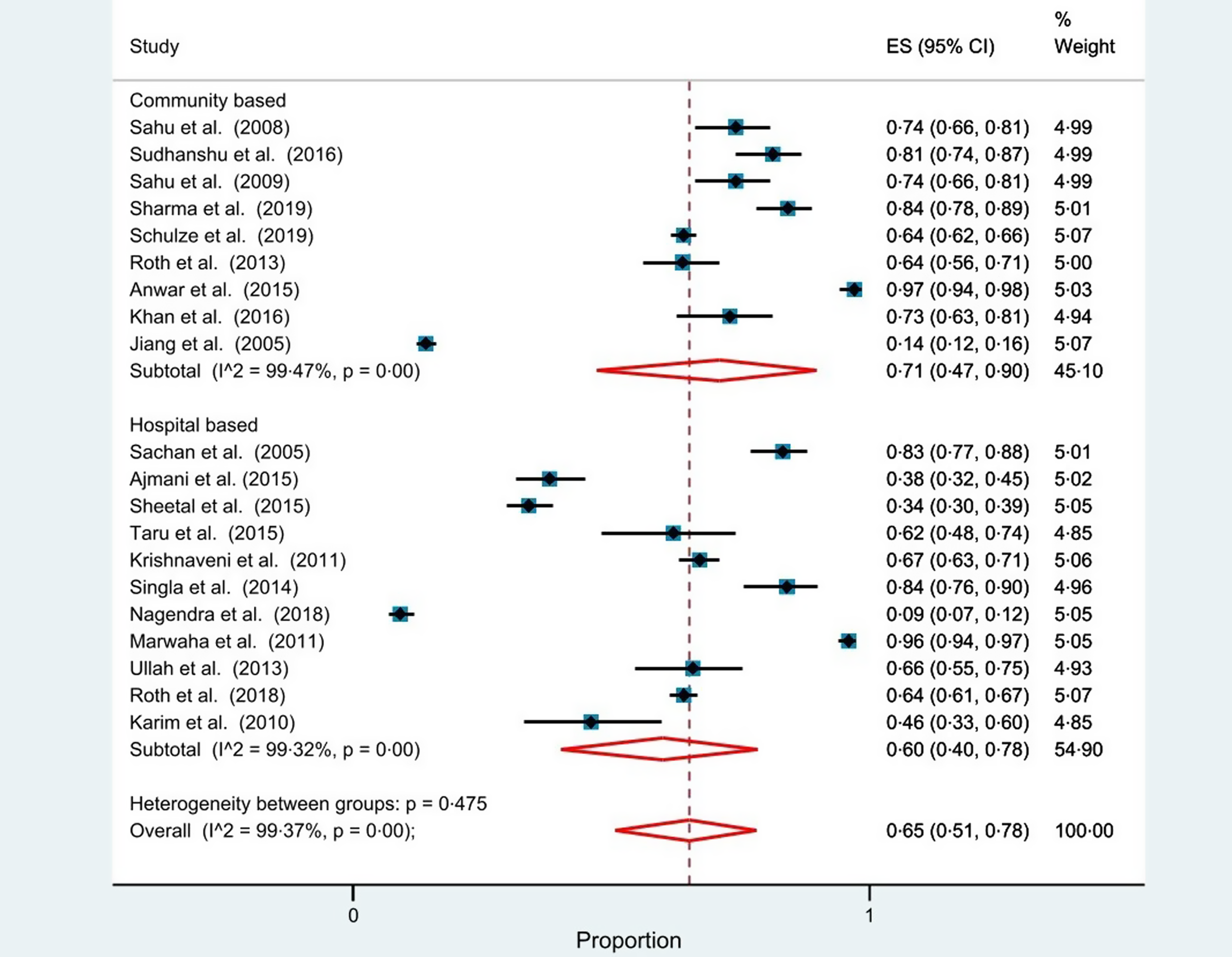 Fig. 3. Forest plot represents prevalence of vitamin D insufficiency in accordance with study settings (community-based v. hospital-based). In this forest plot, all the diamonds, except the last one, represents polled prevalence on the basis of study settings: (1) community-based and (2) hospital-based. Each horizontal line of the forest plot represents an individual study and the box plotted as prevalence for that study. The horizontal points of the diamond represent the limit of 95 % CI.