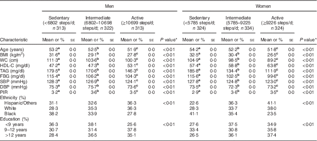Data analysis was performed separately for men and women because it is assumed that men and women have different daily steps( Reference McCormack, Giles-Corti and Milligan 22 – Reference Hirvensalo, Telama and Schmidt 24 ) and sociodemographic characteristics( Reference Ng, Kowal and Kahn 25 , Reference Gallo, Mackenbach and Ezzati 26 ). Three categories of independent variables were created by tertile of accelerometer-determined steps/d (in men and women, respectively): tertile 1 (sedentary), <6802, <5785; tertile 2 (intermediate), 6802–10698, 5785–9225; tertile 3 (active): ≥10699, ≥9226. Means and standard errors were calculated. In sociodemographic characteristics analysis, ANOVA with Bonferroni post hoc testing was used for multiple comparisons to determine mean differences. In food group consumption and serum vitamins analysis, univariate general linear model ANCOVA with Bonferroni post hoc testing was used. Covariates included age, BMI and total energy intake. Logistic regression was used to estimate the odds ratios and 95 % confidence intervals for MetS risk. Covariates included age, BMI, total energy intake, poverty income ratio, ethnicity and education level, and the active steps/d group was considered to be a reference. All reported P values are based on two-sided tests and measured to a significance level of 0·05. The sample weights, WTMEC2YR (full sample 2-year MEC exam weight), WTINT2YR (full sample 2-year interview weight) and WTDR2D (dietary 2-day sample weight), were used in all analyses to obtain unbiased national estimates. Statistical analyses were conducted using the Complex Samples module in the statistical software package IBM SPSS Statistics, version 19.
