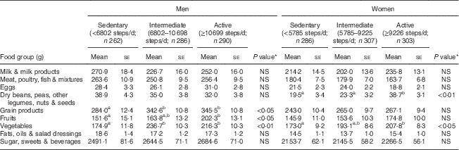 As shown in Table 2, compared with the sedentary group, the active men consumed significantly more grain products, fruits and vegetables, whereas the active women consumed significantly more legumes and vegetables.