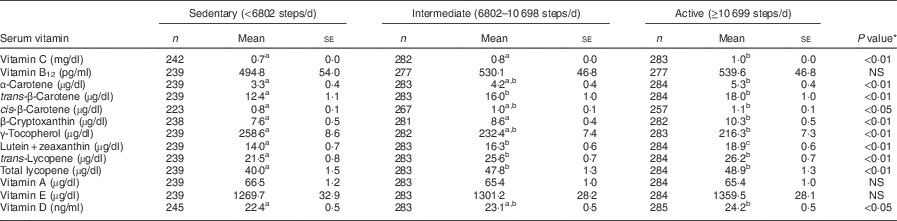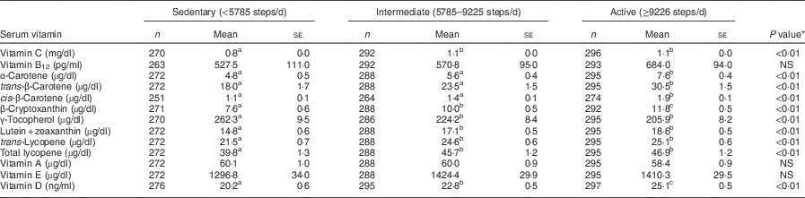 Vitamin C, vitamin B12, α-carotene, trans-β-carotene, cis-β-carotene, β-cryptoxanthin, γ-tocopherol, lutein+zeaxanthin, trans-lycopene, total lycopene, vitamin A, vitamin E and vitamin D in the NHANES 2005–2006 Laboratory file were used for the estimation of serum vitamin status by the level of daily steps. Detailed procedures for phlebotomy, subsequent handling of blood samples and analysis of samples, as well as reporting procedures for each of the serum vitamins, can be found online( 14 ). The assay methods used for measurement of serum analytes are detailed in the NHANES documentation and included the following: HPLC with electrochemical detection for vitamin C; RIA for serum vitamin B12; the two-step Diasorin procedure for vitamin D; and HPLC with photodiode array detection for vitamins A and E, γ-tocopherol and the carotenoids (α-carotene, trans-β-carotene, cis-β-carotene, β-cryptoxanthin, lutein+zeaxanthin, trans-lycopene and total lycopene)( 14 ).