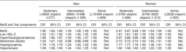 Many studies have been reported that a lack of physical activity is a major risk factor for MetS( Reference Carnethon, Gidding and Nehgme 27 – Reference Ferreira, Henry and Twisk 29 ). The present study also found that lower daily steps were significantly associated with higher risk of MetS. Compared with the active group, OR for MetS were elevated for both men (sedentary, OR =1·85; intermediate, OR=1·29) and women (sedentary, OR=2·47; intermediate, OR=1·55). The OR for components of MetS were also significantly higher than 1·0 for sedentary and intermediate activity groups in men and women. This underscores the importance of regular physical activity in the prevention of MetS and its components in men and women. With regard to the risk difference between men and women, previous studies have reported that the association between sedentary behaviours and MetS is stronger in women than in men, and the risk of MetS is increased more in women than in men with prolonged time spent in sedentary behaviours( Reference Bertrais, Beyeme-Ondoua and Czernichow 30 – Reference Ford, Kohl and Mokdad 32 ). However, it is debatable whether women are more susceptible to developing MetS than men as some studies suggest that men are more likely to develop MetS than women. According to a recent study by Fernádez-Bergés et al.Reference Fernández-Bergés, Cabrera de León and Sanz (33) , in persons aged up to 55 years, MetS is more frequent in men but becomes more frequent in women in persons aged over 65 years.