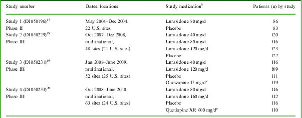 Four similarly designed, placebo-controlled studies of lurasidone were identified that included the Montgomery–Åsberg Depression Rating Scale (MADRS) for evaluation of changes in depressive symptoms in patients with schizophrenia (Table 1). Patient-level data from these studies were pooled in the current analysis. Each study (1 phase II study conducted in the U.S. and 3 multiregional phase III studies) examined the efficacy and safety of lurasidone in the treatment of patients experiencing an acute exacerbation of schizophrenia; the primary results of all 4 studies have been reported elsewhere.Reference Nakamura, Ogasa and Guarino 17 – Reference Loebel, Cucchiaro and Sarma 20