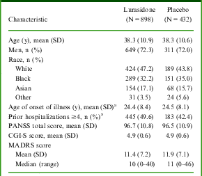 MADRS total scores at baseline and post-baseline were available for 1330 patients with acute schizophrenia (N = 898 lurasidone, N = 432 placebo), who were included in the pooled analysis. Overall baseline demographic and clinical characteristics were similar for patients who were treated with lurasidone (dose groups pooled) and patients who received placebo (Table 2). In these fixed-dose studies, 26.3% of patients received lurasidone 40 mg/d, 35.4% received 80 mg/d, 25.8% received 120 mg/d, and 12.5% received 160 mg/d.