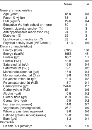 The age-adjusted baseline participant characteristics are presented in Table 1. The mean age was 65·0 (se 0·5) years and mean BMI was 29·6 (se 0·4) kg/m2. In this sample, 85 % were Caucasian, 24 % were taking anti-hypertensive medication, 29 % were classified as having diabetes, and 33 % were taking lipid-lowering medication. Mean baseline whole-grain intake in the subset of women with dietary data (n 190) was 9·6 (se 0·6 servings) per week, in contrast with refined-grain intake of 16·0 (se 0·6) servings per week. Geometric mean plasma AR concentration was 18·0 nmol/l. The distribution of plasma AR was skewed, and the 25th, 50th and 75th percentiles of plasma AR were 10·8, 16·1 and 25·3 nmol/l, respectively.