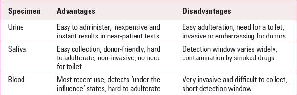 There are, however, several drawbacks. There is often a 3-day window of detection (duration of detection after drug consumption), depending on the individual and the substance used. There is the need of a bathroom to obtain the sample. The specimen is easier to adulterate than others and therefore it may need to be taken under direct observation. This can be degrading and embarrassing (Reference Dolan, Rouen and KimberDolan 2004).