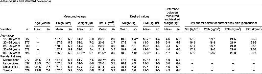 Table 1 also shows the characteristics of the study participants by residential areas. The mean age of the women was similar in the four residential areas. When compared with women residing in towns, BMI values were significantly lower in women from metropolitan areas and large cities (P < 0·05). The mean desired BMI was significantly lower (P < 0·05) in women from metropolitan areas than in women residing in towns. The mean difference between measured and desired weight was smallest in women from large cities, but this was not statistically significant.
