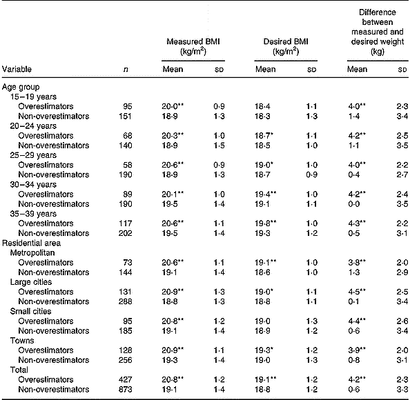 Table 4 Comparisons of the measured and desired body mass index, and ‘difference between measured and desired weight’ between ‘overestimators’ and ‘non-overestimators’ by age group and residential area†