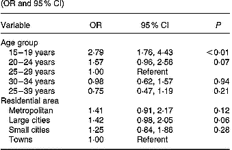 Residential areas were defined by the population size of the woman's current residence. We considered a ‘town’ ( < 50 000 residents) as the base reference area, and compared it with ‘metropolitan areas’ ( ≥ 1 000 000 residents), ‘large cities’ (150 000–1 000 000 residents) and ‘small cities’ (50 000–150 000 residents).