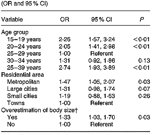 We calculated the OR for the related variables for ‘desire for thinness’ with all subjects, using a multivariate logistic regression model adjusted for the current BMI (Table 6). In regard to age group, 756 were defined as having ‘desire for thinness’ in the analyses. The OR for ‘desire for thinness’ were 2·26 (95 % CI 1·57, 3·24; P < 0·01) in the 15–19-year age group and 2·74 (95 % CI 1·93, 3·89; P < 0·01) in the 35–39-year age group, compared with the 25–29-year age group. In regard to residential area, 747 women were defined as having ‘desire for thinness’. The OR for ‘desire for thinness’ increased as the population size increased. The OR was significantly higher in women who resided in metropolitan areas (OR 1·47 (95 % CI 1·05, 2·07); P = 0·03). In addition, women who had overestimated their body size (n 427) were 1·33 times more likely to have ‘desire for thinness’ than those who did not (OR 1·33 (95 % CI 1·03, 1·70); P = 0·03).