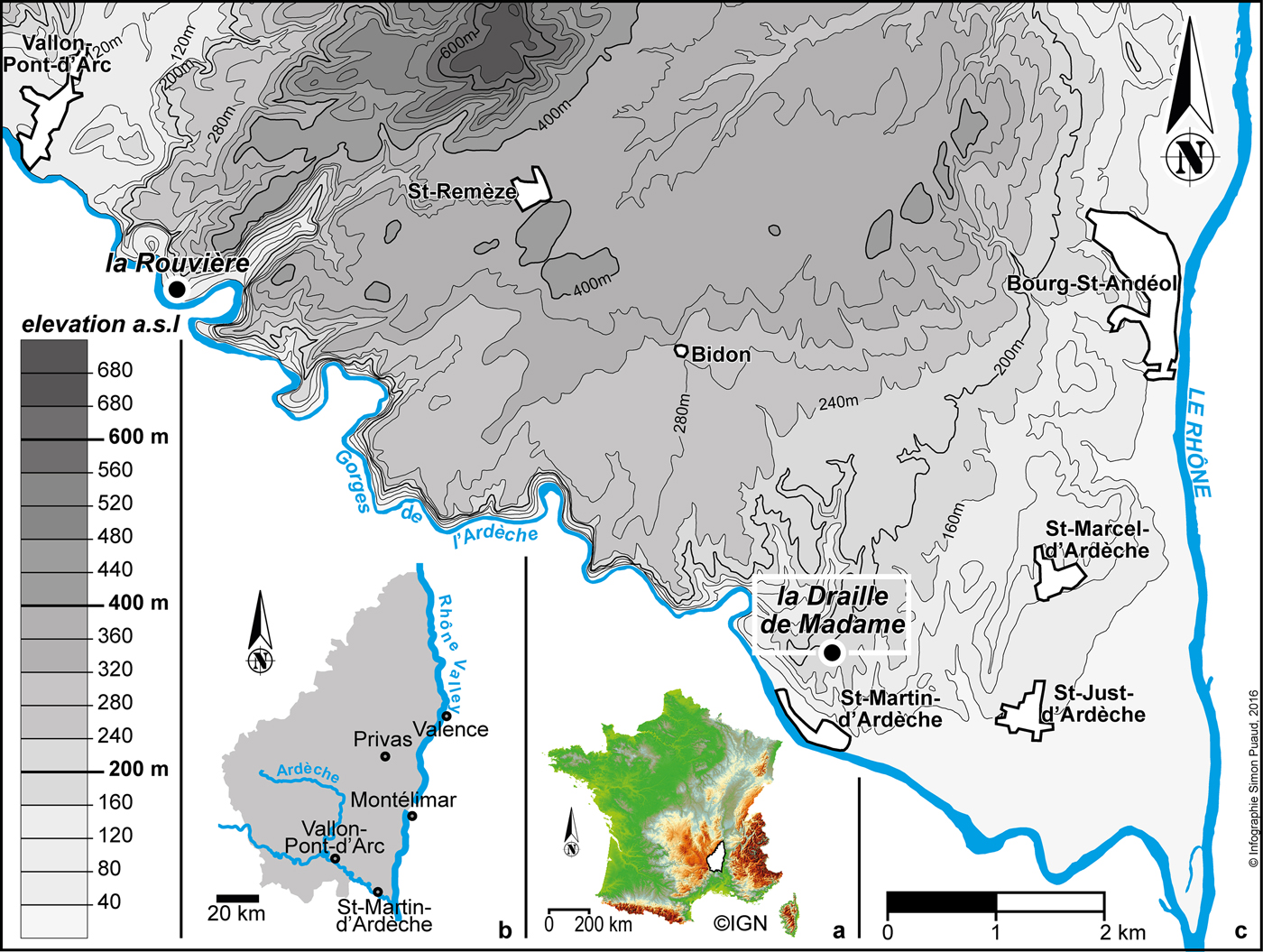 Figure 1. Map of the middle part of the Rhône Valley, showing the right (north) bank of the river; the site is located on the interfluve at 160–175m asl (figure by Simon Puaud).