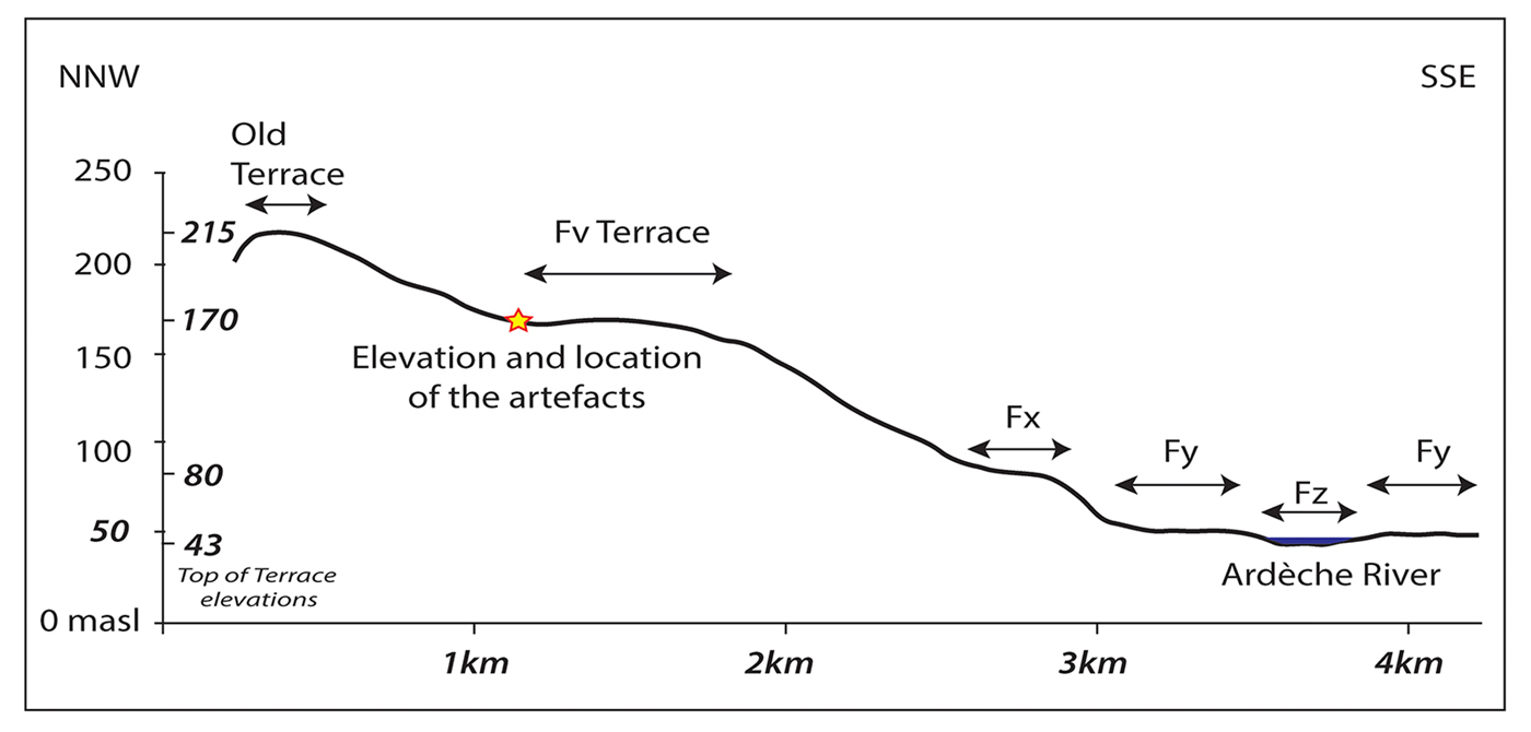 The artefacts were found in the Ardèche alluvial terraces. Previous studies show four levels of terraces (Labrousse Reference Labrousse1977; Pascal et al. Reference Pascal, Elmi, Busnardo, Lafarge, Truc and Valleron1989), ranging from the present floodplain of the Ardèche River (level Fz) to the highest terrace where the artefacts were located (level Fv). A large plane surface corresponds to the Fv terrace and flanks the pediment.